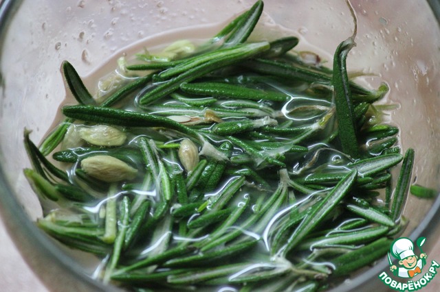 Первым делом обрываем листочки с веточек розмарина и заливаем их соком, выжатым из ОДНОГО лимона. Пусть настаивается.