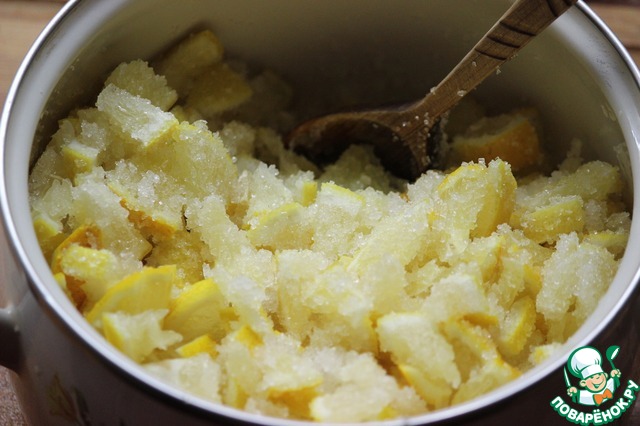 Хорошенько перемешиваем и незамедлительно добавляем в кастрюльку с булькающими лимончиками. Теперь хорошенько перемешиваем наш конфитюр.