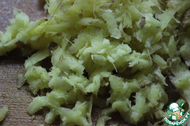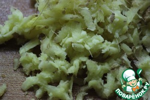 Сразу же натираем на терке имбирь и незамедлительно вместе с соком отправляем его в кастрюльку.