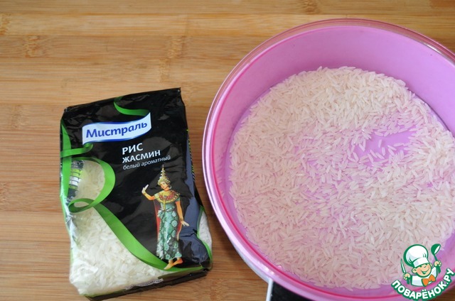Берём рис, отвариваем. Я использовала рис "Жасмин" ТМ "Мистраль". Заливаем рис водой в соотношении 1 к 2, доводим до кипения и варим на медленном огне 12 минут.
