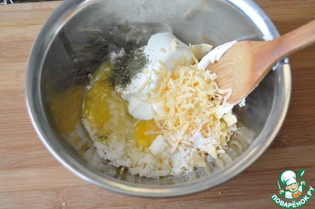 Добавляем яйца, сметану, тёртый сыр, разрыхлитель, соль, петрушку (у меня сухая). Перемешиваем.