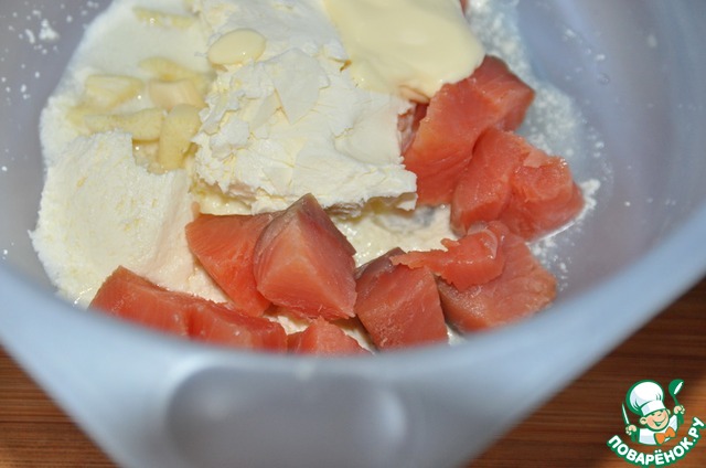 Готовим начинку. В миску кладём: творожный сыр, майонез (или сметану), чеснок, кусочки филе копчёной красной рыбы (у меня кета). Всё измельчаем блендером в пасту.