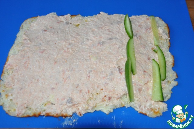 Намазываем пласт творожной начинкой. С краю кладём несколько брусков свежего огурца.