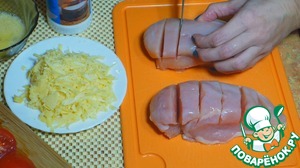 Куриное филе надрезать, посолить сверху с двух сторон и в надрезах.