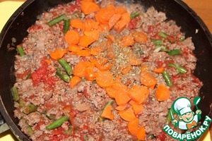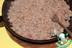 Добавить фарш, готовить, помешивая и разминая вилкой комки, 15 мин.