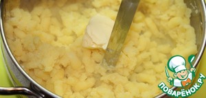Сверху выложить картофельное пюре. Выложить сверху кусочки сливочного масла.