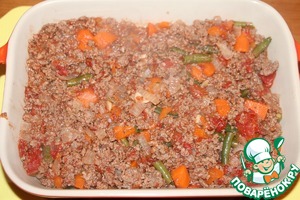 Огнеупорную форму щедро смазать сливочным маслом, положить в нее начинку.