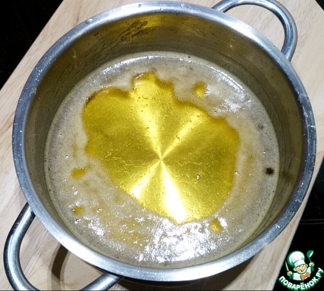 • Пока запекается пирог, готовим сироп. Для этого смешиваем воду, сахар и мед, помешивая до полного расствориния последних в воде, доводим смесь до кипения, а потом кипятим на среднем огне минут 5 до легкого загустения. Мне понадобилось 10 минут, чтобы зрительно объем чуть уменьшился.