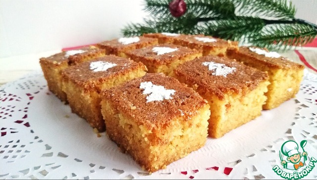 • Готовый горячий пирог обильно поливаем сиропом, а затем нарезаем на квадратики.