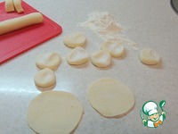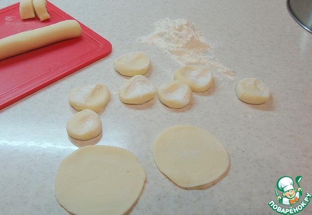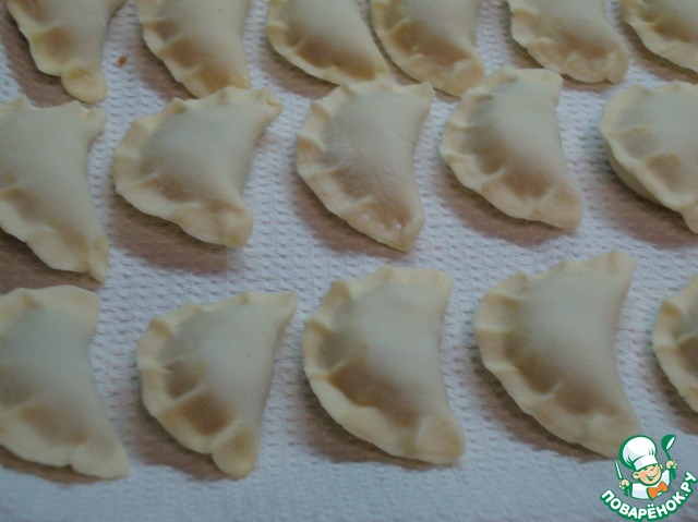 Лепить вареники удобным для вас способом. Я делаю жгут, затем нарезаю на кусочки, раскатываю сочни, кладу начинку и леплю вареник. |