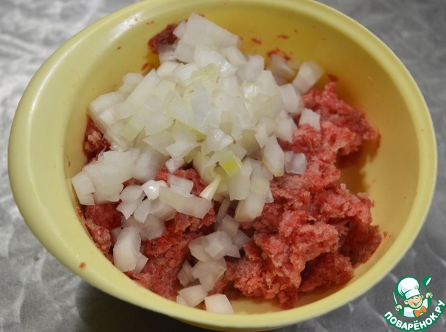 Фарш солим, добавляем приправу и мелко нарезанный лук. Перемешиваем.