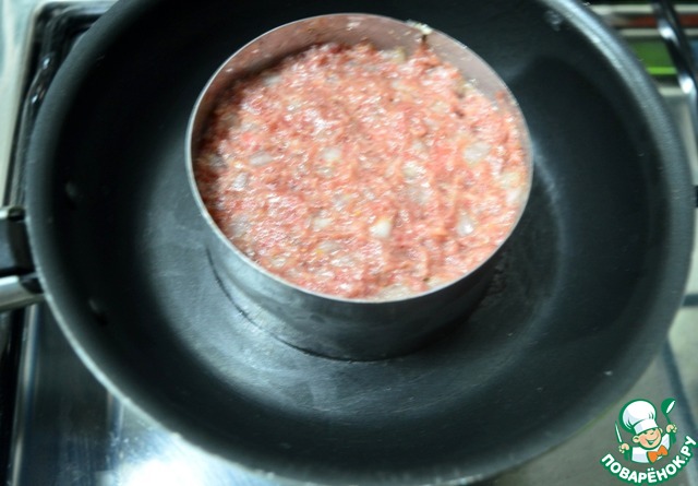 Ставим формовочное кольцо на сковороду, смазанную растительным маслом. Выкладываем фарш в кольцо. Жарим ровненькую котлетку.