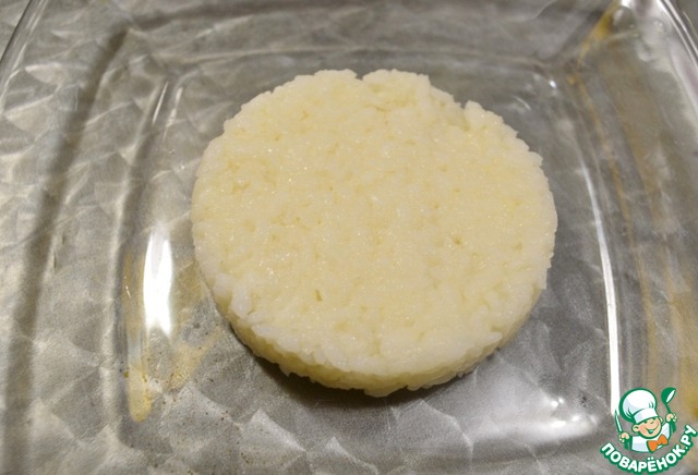 На тарелку выкладываем часть риса через формовочное кольцо.