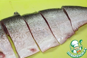 Рыбу, желательно с кожей, нарезать порционными кусками, натереть солью.