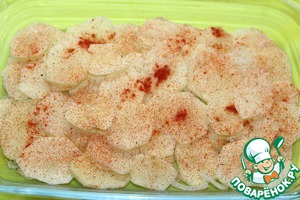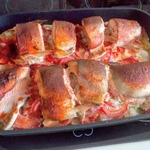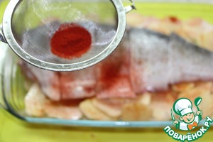 Выложить куски рыбы, залить сливками, еще раз припудрить паприкой.