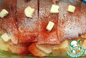 Выложить поверх рыбы сливочное масло, нарезанное кусочками.