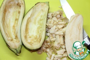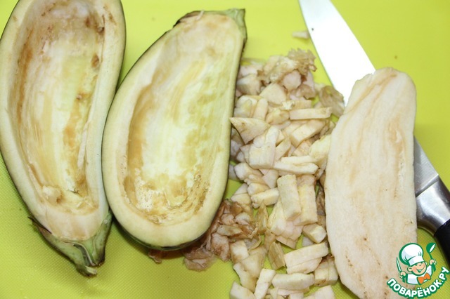 Баклажан вымыть, разрезать пополам, аккуратно вытащить мякоть, оставляя стенки толщиной не менее 0,7 мм. Мякоть порезать кубиками. Присолить и лодочки и мякоть на 15 минут. Затем соль смыть, воду с мякоти отжать, лодочки промокнуть бумажным полотенцем.