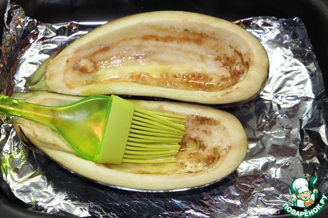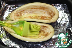 Баклажан смазать внутри растительным маслом, поставить запекать на 20 минут при 200 градусах.