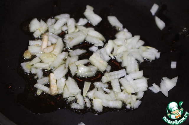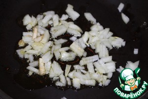 Измельчить лук и чеснок. Разогреть 1 ст л растительного масла в сковороде, лук и чеснок обжаривать на небольшом огне 2 минуты, не допуская зажаривания.