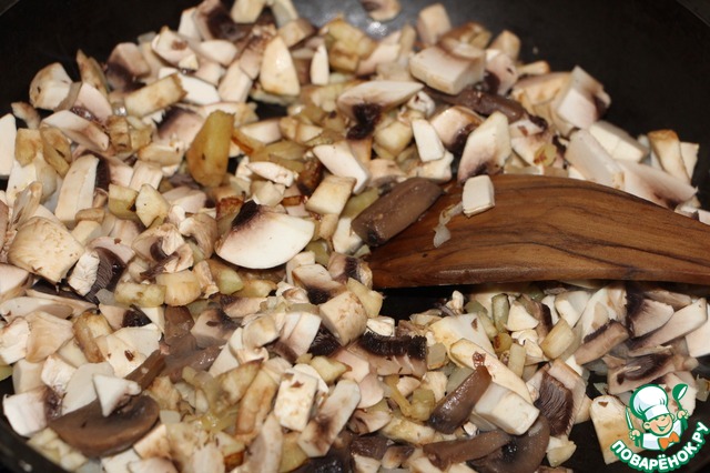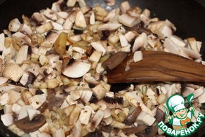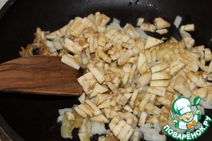 Добавить грибы, порезанные кубиками. Готовить до испарения влаги, минут 5 на сильном огне, помешивая.