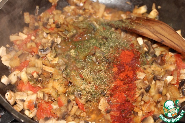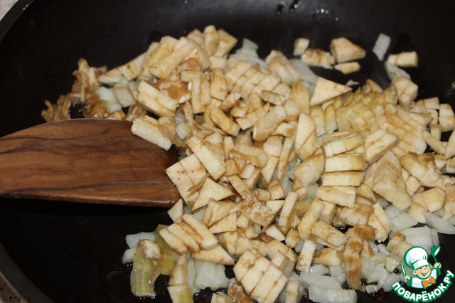 Добавить мякоть баклажан, обжаривать 7-8 минут.