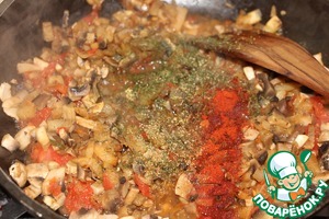 Добавить помидор, порезанный кубиками, сухой укроп и базилик, перемешать, тушить ещё 5 минут. Дать грибной смеси немного остыть.