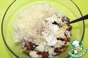 Добавить тёртый на мелкой тёрке сыр и размятую Фету. Перемешать, посолить и поперчить по вкусу.