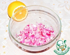 Лук мелко нарезать и залить столовой ложкой лимонного сока.