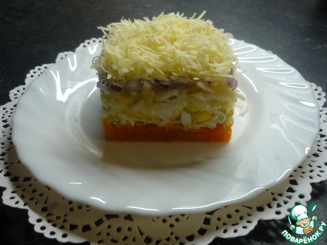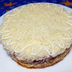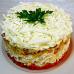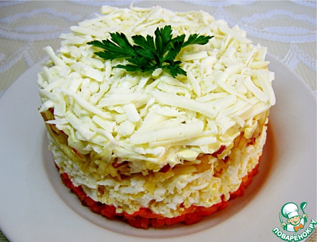 Если нет желания и времени выкладывать салат слоями, просто перемешать все ингредиенты, кроме сыра, и заправить салат соусом. Сверху присыпать сыром.