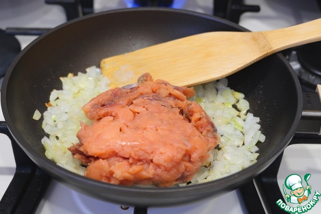 Добавить к пассерованному луку нарезанное мелкими кубиками филе горбуши. Тушить смесь до готовности.