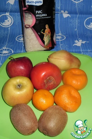 - Ассорти фруктовое (Любые фрукты очищенные от кожуры и зерен. Фрукты на ваш вкус, у меня яблоки, хурма, груши, мандарины, киви) — 600 г