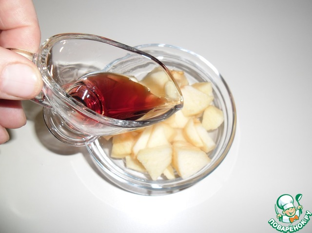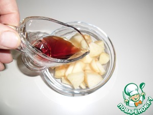 Кусочки яблок заправить вином. Это придаст особый пикантный вкус салату.