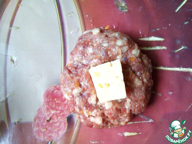 Далее из фарша формируем котлеты и на середину кладем кусочек сыра
