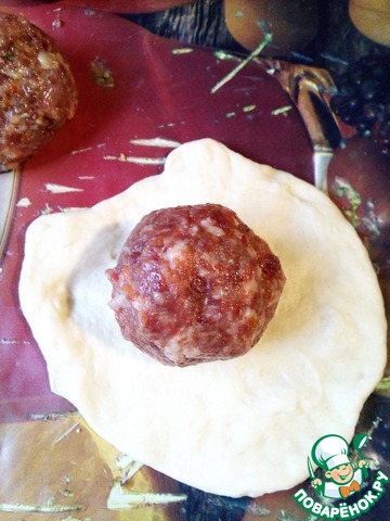 Тесто разделить на части, сделать лепешки, на середину которых кладем наши мясные шарики.