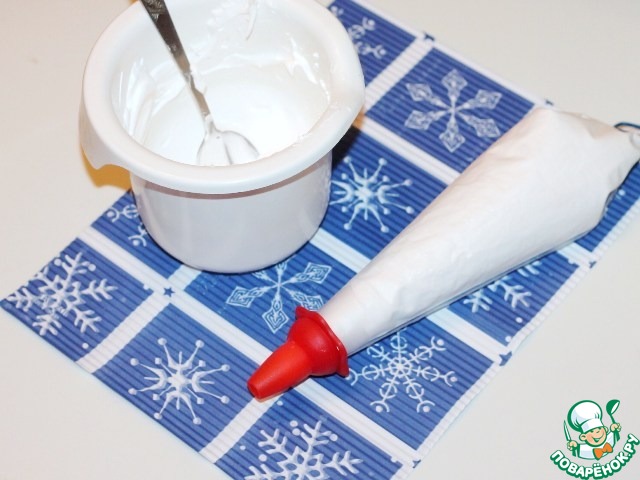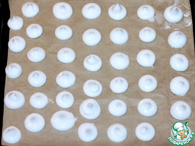 3. Застилаем противень бумагой для выпечки и при помощи корнетика, отсаживаем безе. Выпекаем безе в разогретой до t 100-140 С в духовке, минут 20.