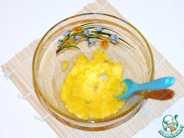 5. Приготовим пирог. Желтки растереть с сахаром. Добавить сметану, растопленное и охлажденное масло и ванилин, перемешать.