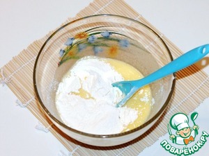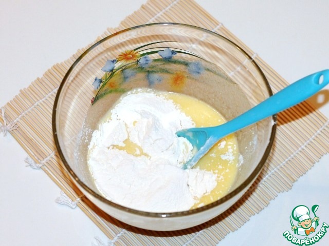 6. Всыпать просеянную муку с разрыхлителем. Взбить тесто до однородности.