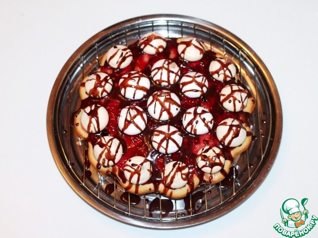 8. Приготовленный пирог немного остудить, извлечь из формы и сразу же намазать джемом. Дать джему немного застыть и уложить сверху безе. Укладывать безе, можно горкой или как на фото. Оставшееся безе можно спаривать при помощи джема.