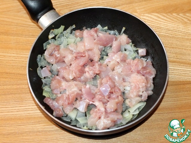 8. Куриное филе очень мелко рубим и добавляем к луку, обжариваем до бела, 2-3 минуты.