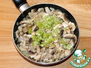 9. Затем очищаем, моем и нарезаем грибы небольшими пластинами, добавляем в сковороду. Кладем 1 ст. л. сливочного масла.