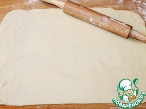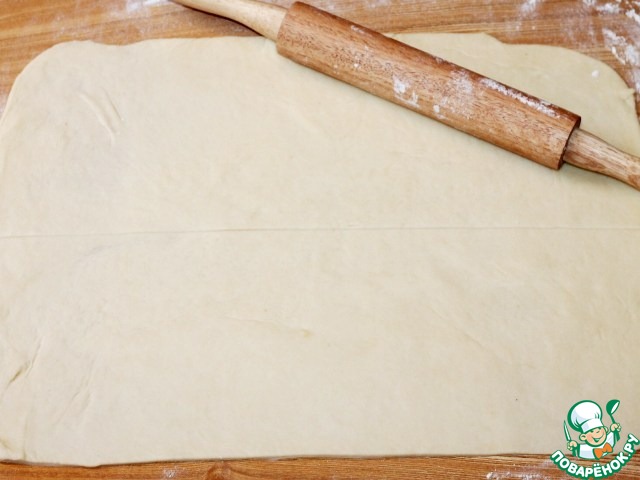 11. Припыляем столешницу мукой. Готовое тесто раскатываем в прямоугольный пласт 30*40. Визуально делим пласт на 2 части.