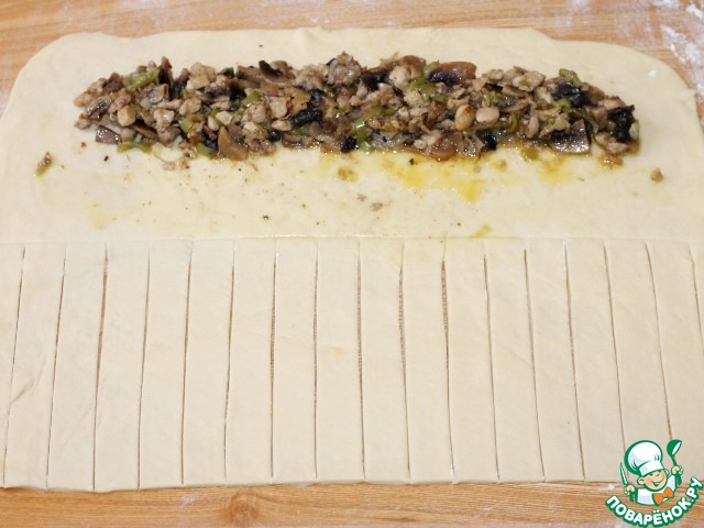 12. На верхнюю часть пласта выкладываем начинку, а нижнюю часть разрезаем вертикальными полосками, шириной 1,5 см.