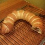 14. Застилаем противень пекарской бумагой и смазываем маслом. Перекладываем рулет на противень и формируем калач, в виде подковы.