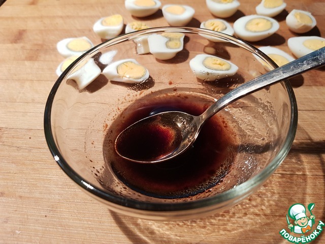 Увидел данный рецепт в передаче на первом канале. Решил воспроизвести. Закуска получилась отличная. Сам в первые варёные яйца обжаривал. Довольно оригинально получилось. Заменил только куриные яйца на перепелиные, ну и в количестве продуктов тоже внес изменения.