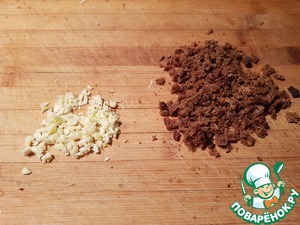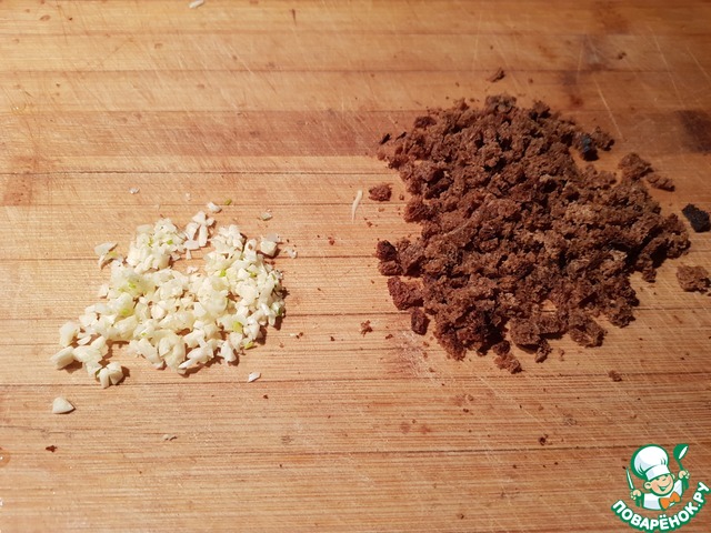 Мелко нарубаем чеснок и крошим хлебушек.