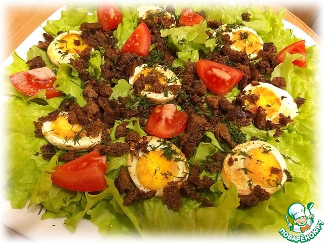 Из сковородки перекладываем яйца на салат, выкладываем чеснок с хлебом в сковороду и обжариваем в течении 3-4 минут, постоянно помешивая. Хлебно-чесночной смесью пересыпаем яйца. Украшаем порезанным укропом, можно взять огурцы, помидоры ну или как Вам подсказывает фантазия. Подаем к столу. Замечательная закуска на праздничный стол.
