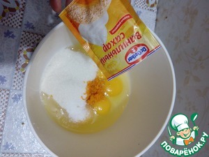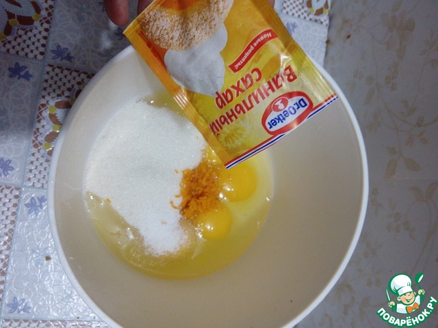 Яйца, обычный сахар, ванильный сахар и цедру взбиваем миксером до полного растворения сахара.