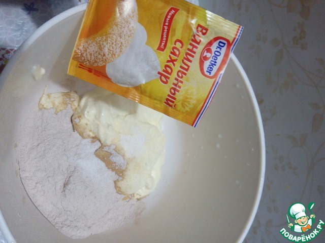 Начинаем делать сметанно-коричную прослойку. Смешиваем сметану, сахарную пудру и ванильный сахар. Взбиваем миксером минуты 3.
