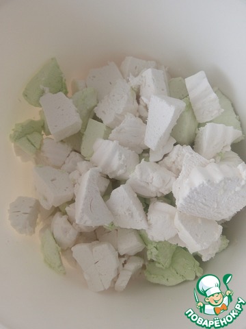 Готовим крем. Зефир мелко режем и отправляем в СВЧ на 2-3 минуты. За это время он должен полностью расплавиться.