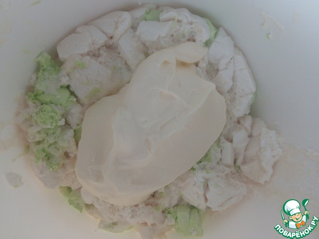 Затем к зефиру добавляем сметану. И взбиваем все миксером по получения однородной массы.